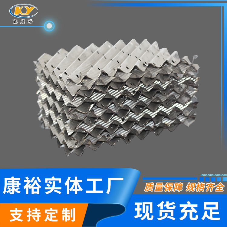 金属孔板波纹填料(即金属规整波纹填料、不锈钢孔板波纹填料或称金属波纹填料)是在金属薄板孔面打孔、轧制小纹、大波纹后组装而成,具有阻力小,气液分布均匀,效率高,通量大,放大效应不明显等特点,应用于负压常压和加压操作。