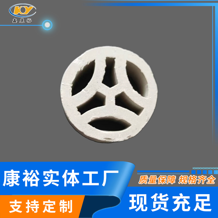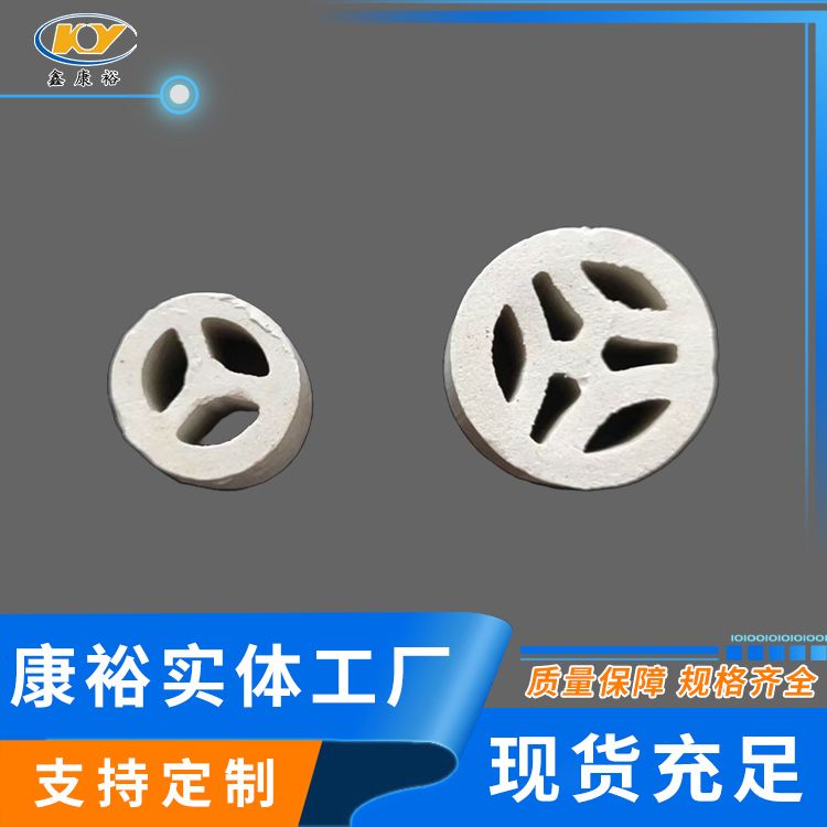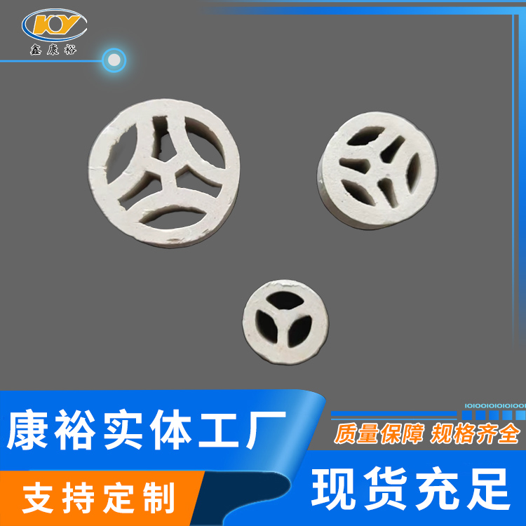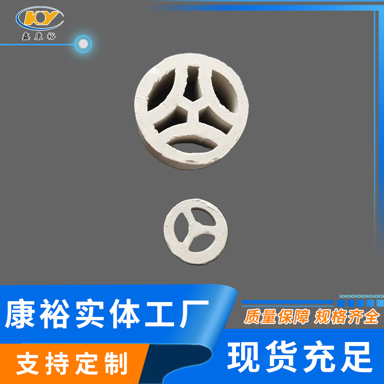 陶瓷三丫环因其优异的工艺加工条件,如原料优选,真空挤压成型以及严格控制烧结工艺中的火焰气氛,使得陶瓷三丫环具有瓷质致密,色泽均匀,机械强度高,耐压力冲击,抗热震性能好,耐搬运不破损的优点。同时陶瓷三丫环结构空间性能好,床层使用通气量大、比表面大、气液分布均匀、阻力小、压降低、强度高、气液传质性能比一般填料好。