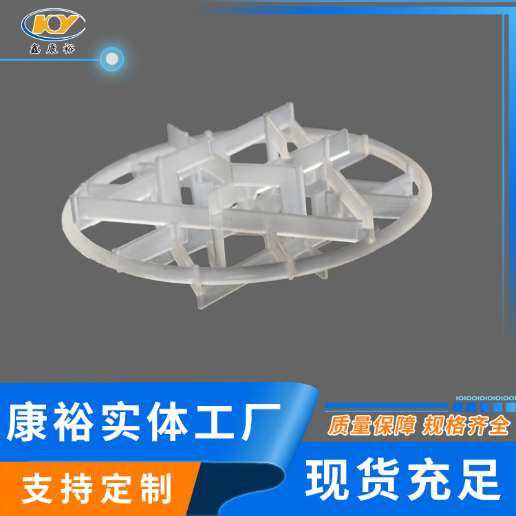塑料雪花环具有空隙率大、耐热、耐化学腐蚀,压降和传质单元高度低,泛点高、汽液接触充分、比重小、传质效率高等特点。在各种介质中的使用温度为60-150摄氏度,广泛用于石油、化工、氯碱、煤气、环保等行业的填料塔中。