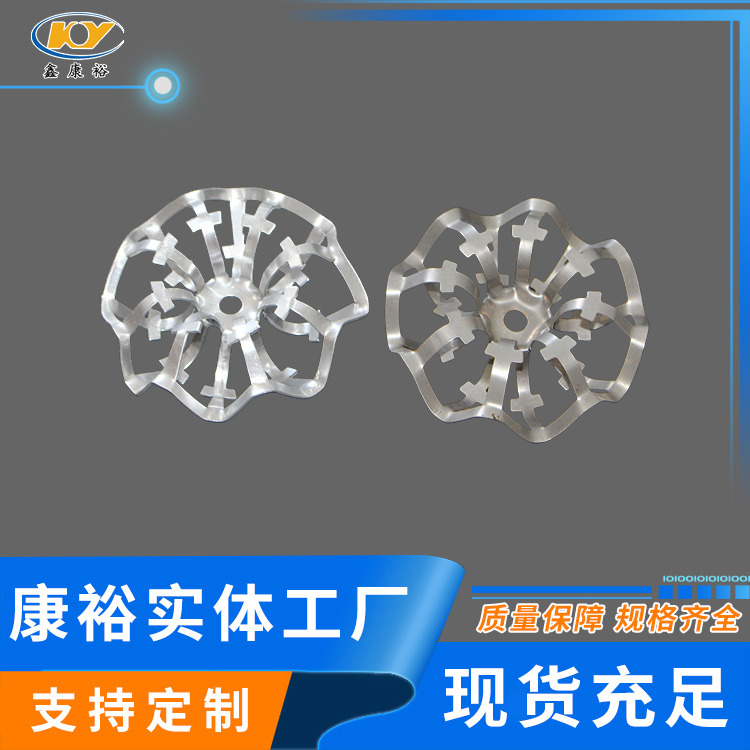 铝花环填料主要材质为铝合金,产品采用铝合金板冲压制成,外观为椭球状填料,包括有由一块板材一体成型内环和外环,该内环与外环之间连接有筋,所有筋是由上半圆环筋和下半圆环筋构成,每两相邻筋由上半圆环筋和下半圆环筋交错排列。这样具有比表面积大,单位重量轻。产品除具有一般的通量大、不易被堵塞、通量大、阻力小、压降低等优点外,还由于填料的空隙处能有较高的持液量,可使塔内液体的停留时间较长,从而增加了气液两相的接触时间,提高了填料的传质效率。